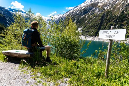Schon von Weitem sieht man die imposante graue Staumauer, welche einem die Motivation gibt, die 450 Höhenmeter hinauf zu steigen. Oben angekommen steht man vor dem mächtigen Stausee, welcher türkis in der Sonne glitzert. Der Speichersee Zillergrund füllt das Tal mit türkisblauem Wasser und rundherum erstrecken sich Berge.